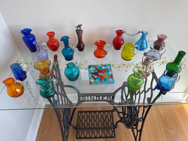 I can relate to this quote. I have a fondness for colored glass. I have been collecting colored glass for years. And although my collection of colored mini-vases is small, it makes me happy every time I see it. In addition, I have multiple colored glass dishes that I like to use. I still enjoy scouting out antique and thrift shops for my next find.