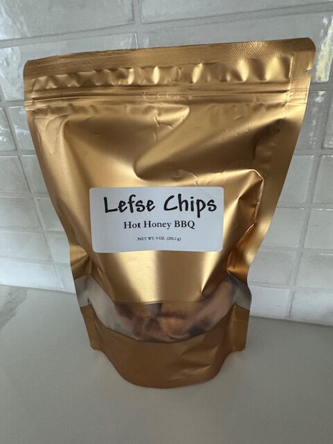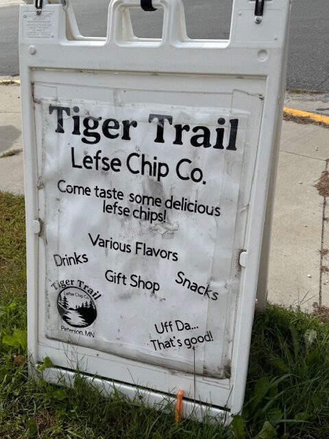 I saw the words “lefse chips” and, being the Norwegian that I am, all things lefse makes me curious. So we veered off the trail and biked a block into the small town of Peterson, population 227.