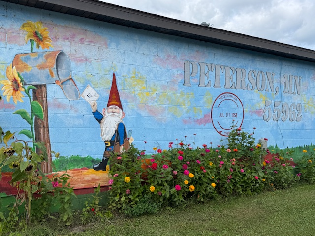More cyclists stopped to explore the store too, and it felt festive on this chilly morning in this small town… that has big displays of gnomes, including statues, flags and wall murals.