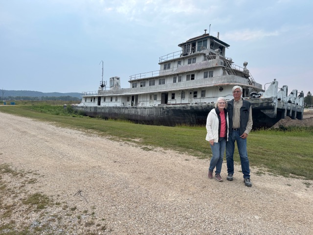 It was intriguing to see this “pushboat” resting on land on the banks of the river, near Prairie du Chien. (This is when the internet is so useful. We found the faded name of the boat, on the outside of the bridge, so we looked up Wade Childress and found information.) We learned it had sunk near Fort Madison Iowa in 1985.
