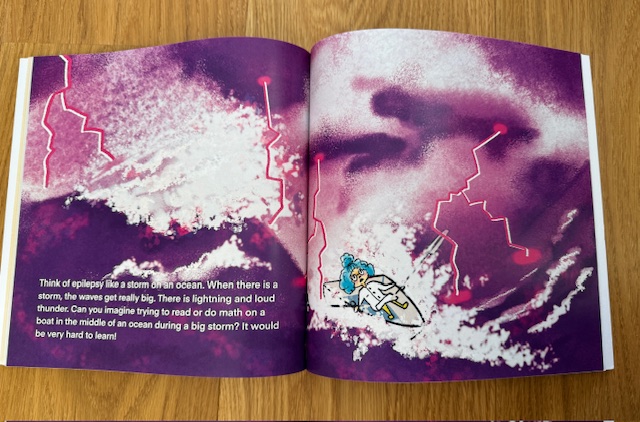 The book starts out explaining our brains are electric, and our brain power “sends messages to your entire body. But in some people, the electric activity in their brains becomes stormy and chaotic, causing a seizure.”