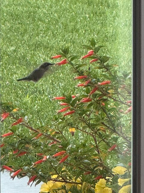 One of the evenings we were sitting out on our patio enjoying dinner and summer offerings…comfortable weather, sunny, blue skies fading into dusky skies, and no mosquitos!