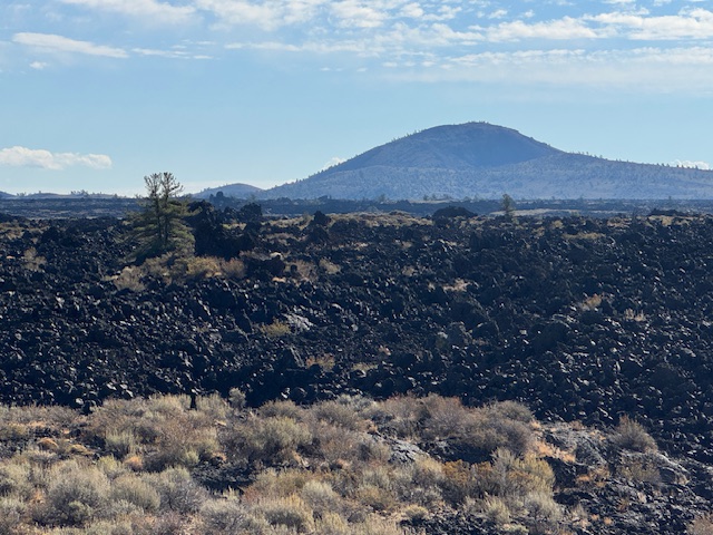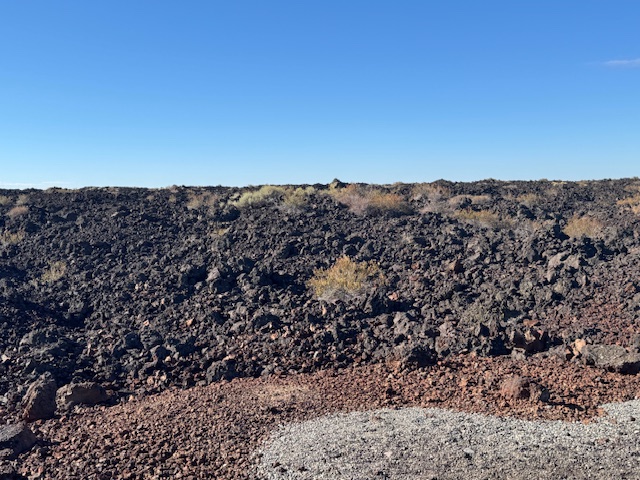 It was a sunny, but chilly day when we visited the Craters of the Moon National Monument. It features vast lava fields deposited from volcanic eruption of deep fissures years ago. At the Visitor’s Center we picked up a map of a seven-mile driving loop through the park. There were designated stops along the way to get out for a scenic overlook, or take a hike. We did both.