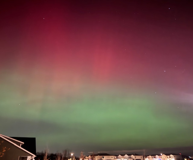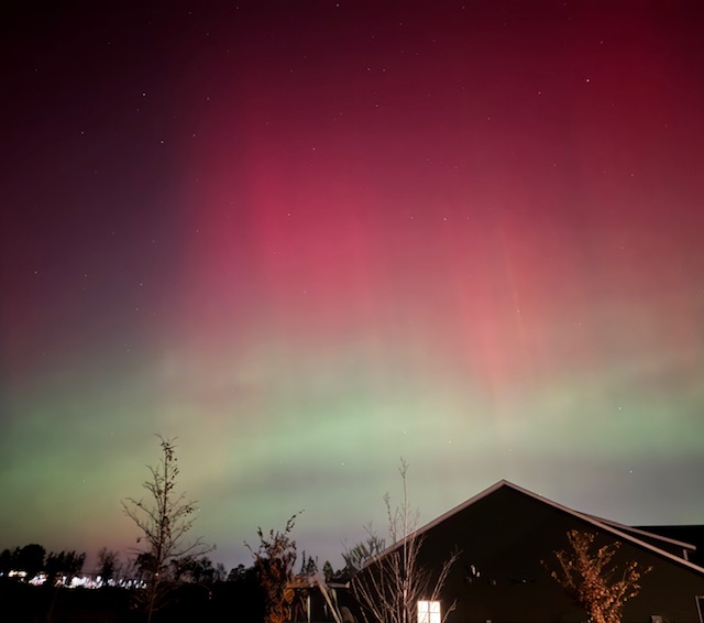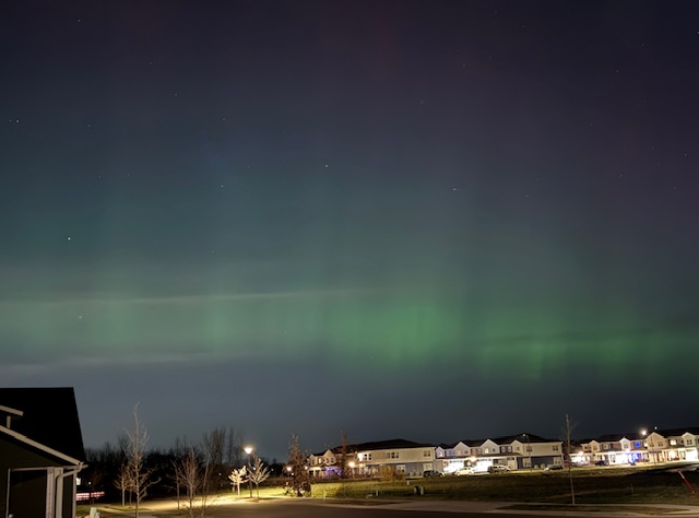 It’s not often one gets to see the northern lights, especially in town, and in southern Minnesota, but the last two nights there were wonderful displays right outside our front door. A neighbor sent a photo in a text alerting me to check out the spectacular show on Tuesday evening.