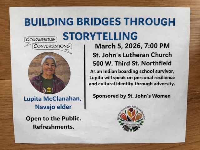St. Johns Lutheran Church in Northfield hosts a monthly event called Creating Community for Common Good – Courageous Conversations, and it is open to the public. Their focus is to invite speakers who will “enlighten local and national implications for education, housing, health care and the environment, as well as freedom of expression and equality.”